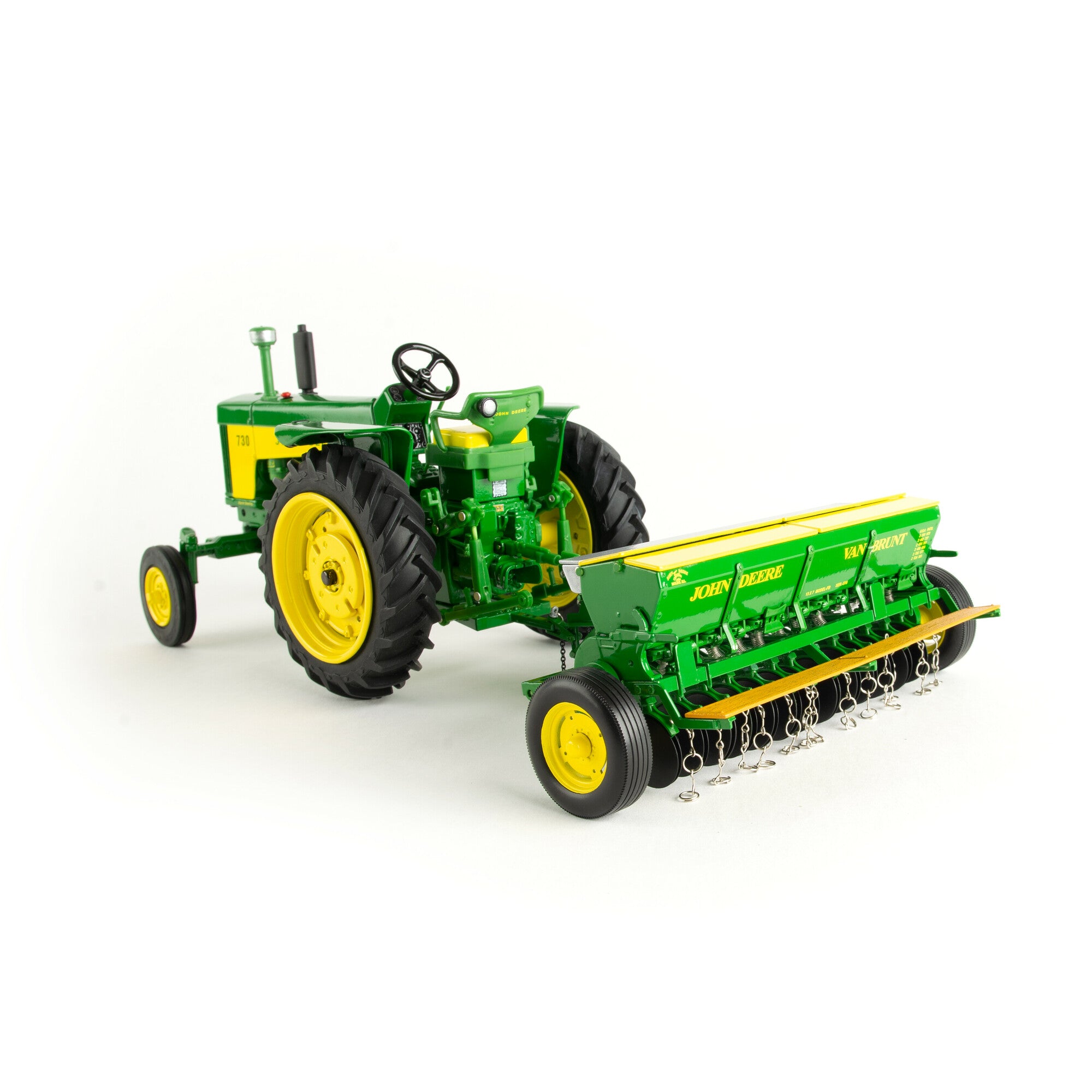 Part of our Prestige Collection. Detailed 730 tractor with die-cast wide front axle, hood, body and fenders. Featuring tie rod steering and three point hitch that raises and lowers. The grain drill features die-cast body and tongue. Soft feel tires mounted on die-cast wheels.
